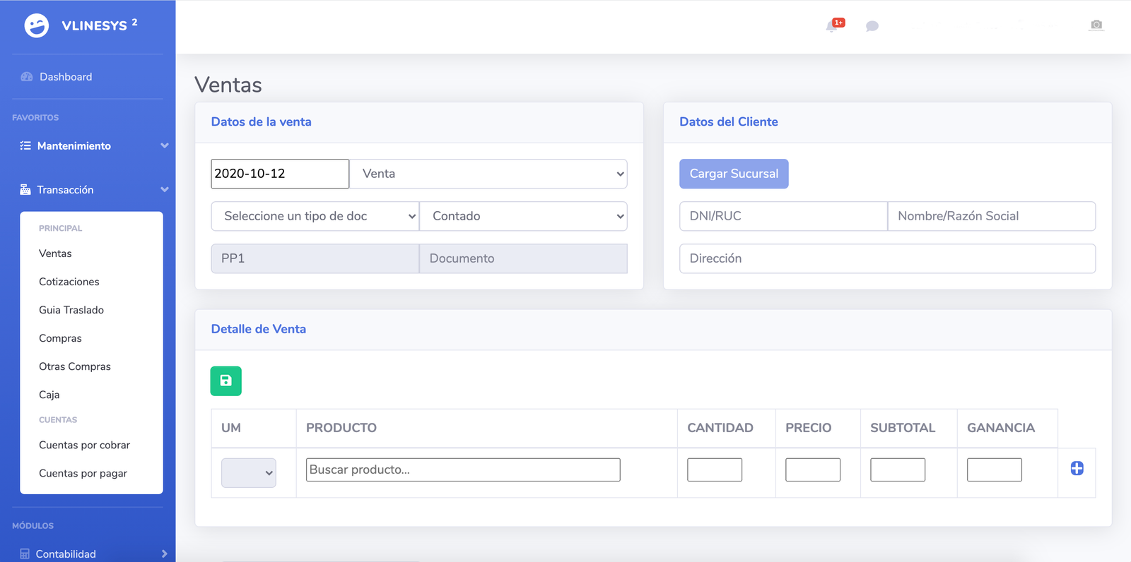 Conoce más funciones...Con pocos clic's puedes realizar una venta o una compra debido a los accesos sencillos. Nuestro sistema también cuenta con conexión a SUNAT y RENIEC para la busqueda rápida de tus clientes.